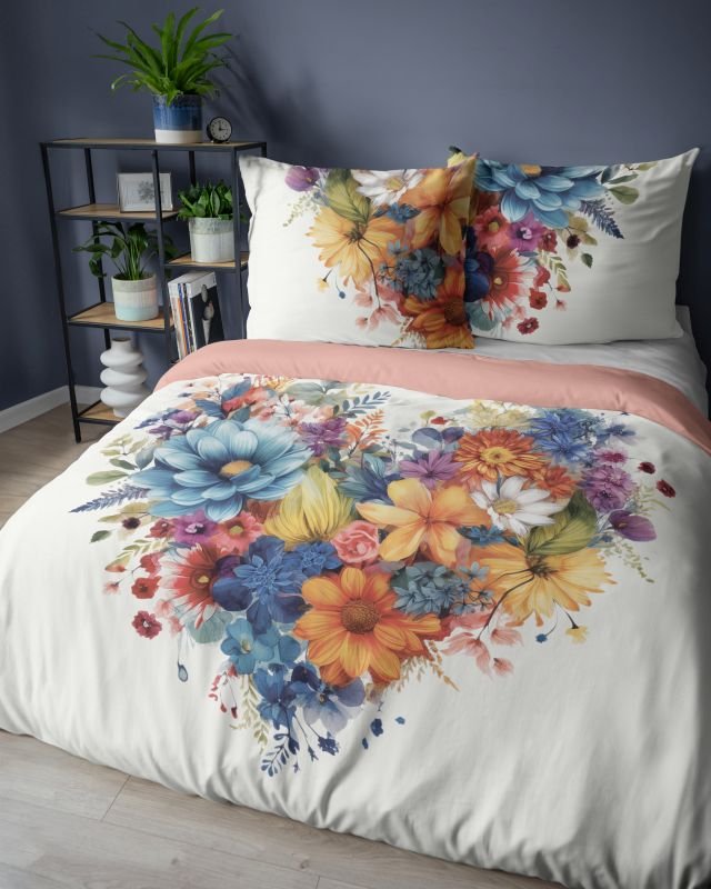 Povlečení Květy heart je jemné a velice příjemné na dotek. Povlečení s velkým květinovým srdcem na bílém podkladu, druhá strana je jednobarevná. Kvalitní povlečení Květy heart je vyrobeno ze 100% bavlny. Bavlněné povlečení na francouzskou postel Květy heart v rozměru deka 220cm x 200cm a 2x polštář 70cm x 80cm. Francouzské povlečení Květy heart má zapínání na zip.