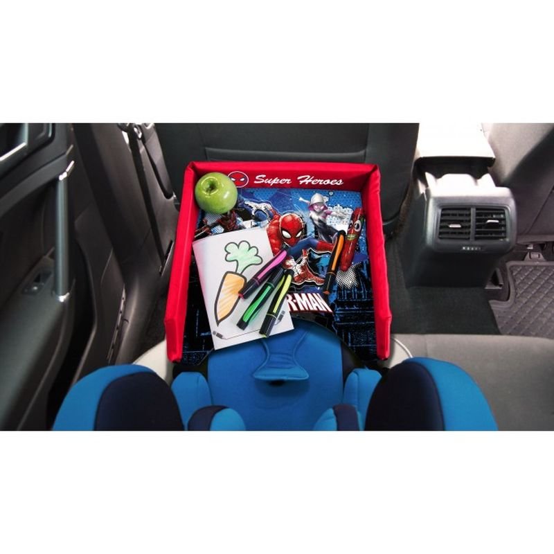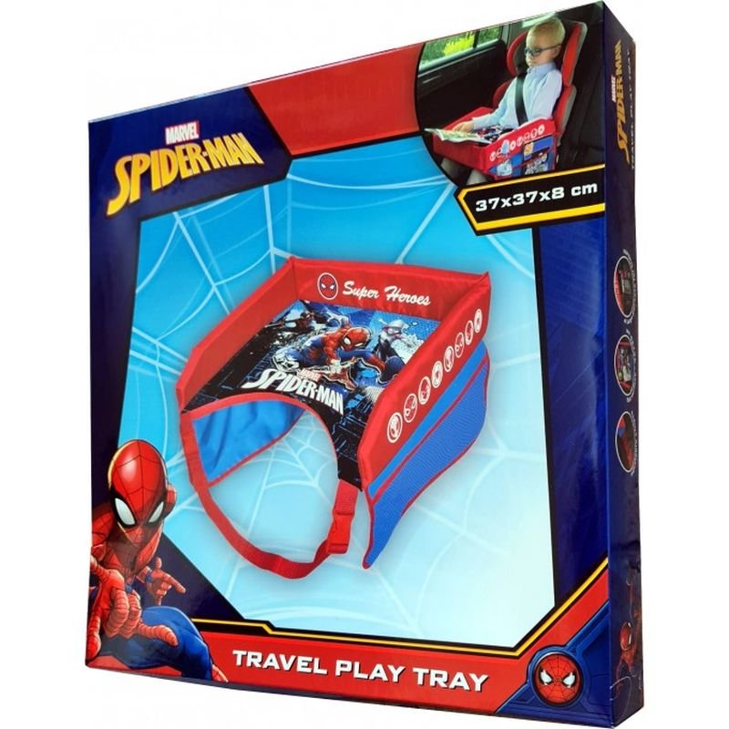 Cestovní stolek Spiderman. Cestovní stoleček pro děti s oblíbeným motivem Spiderman zpříjemní dětem cestování. Praktický a užitečný stolek při jízdě umožňuje dítěti mít po ruce své malé věci. Ať už jde o knihu, kreslení, svačinu či dětskou hru. Cestovní stolek Spiderman má čtyři boční kapsy a pracovní prostor je omezen vysokými mantinely, které zabraňují pádu předmětů. Pokud se pití vylije a nebo jídlo spadne, dítě zůstane v suchu a čisté. Snadná instalace, s nastavitelným popruhem. Cestovní stolek Spiderman je vyroben z měkkých materiálů. Tento praktický autodoplněk můžete využít v autě, vlaku či letadle a nebo v autobuse. Lze jej užívat takév dětském kočárku - golfkách. Celý potah lze prát v pračce na 40° s programem ruční praní. Není hračka