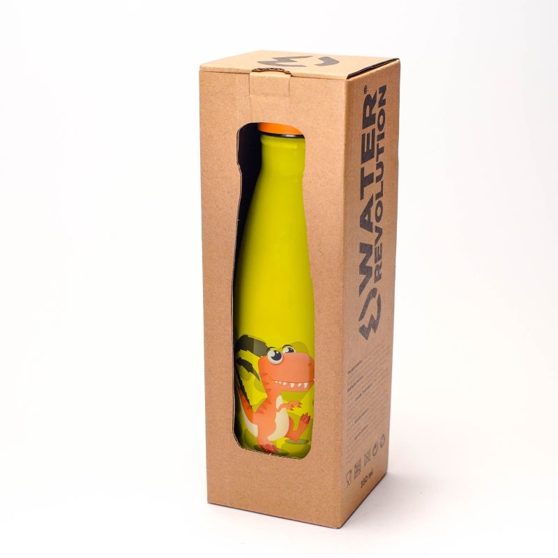 Dětská nerezová Termo láhev na pití Dino. Dětská láhev na pití Dino je vyrobená z potravinářské nerezové oceli bez toxinů. Víčko s výklopným brčkem je z plastu bez obsahu BPA. Nerezový vnitřní povrch láhve nechytá žádné pachy. Dětská nerezová termo láhev na pití Dino má obsah 500 ml, rozměr 22,5x7cm, váha jen 140 g. Široké hrdlo na nalévání nápoje 4 cm. Nevhodná do myčky na nádobí a do mikrovlné trouby, myjte v ruce.